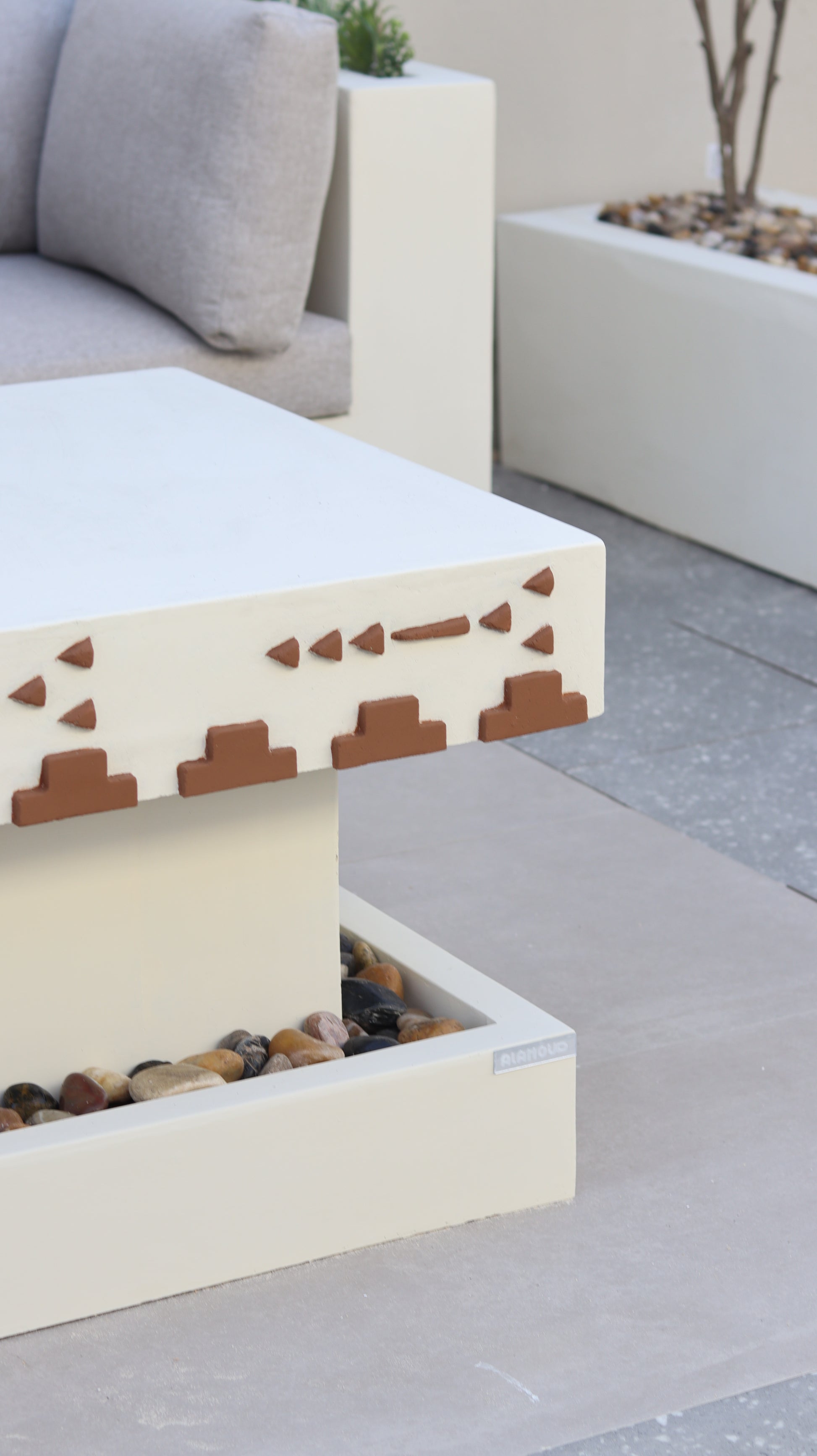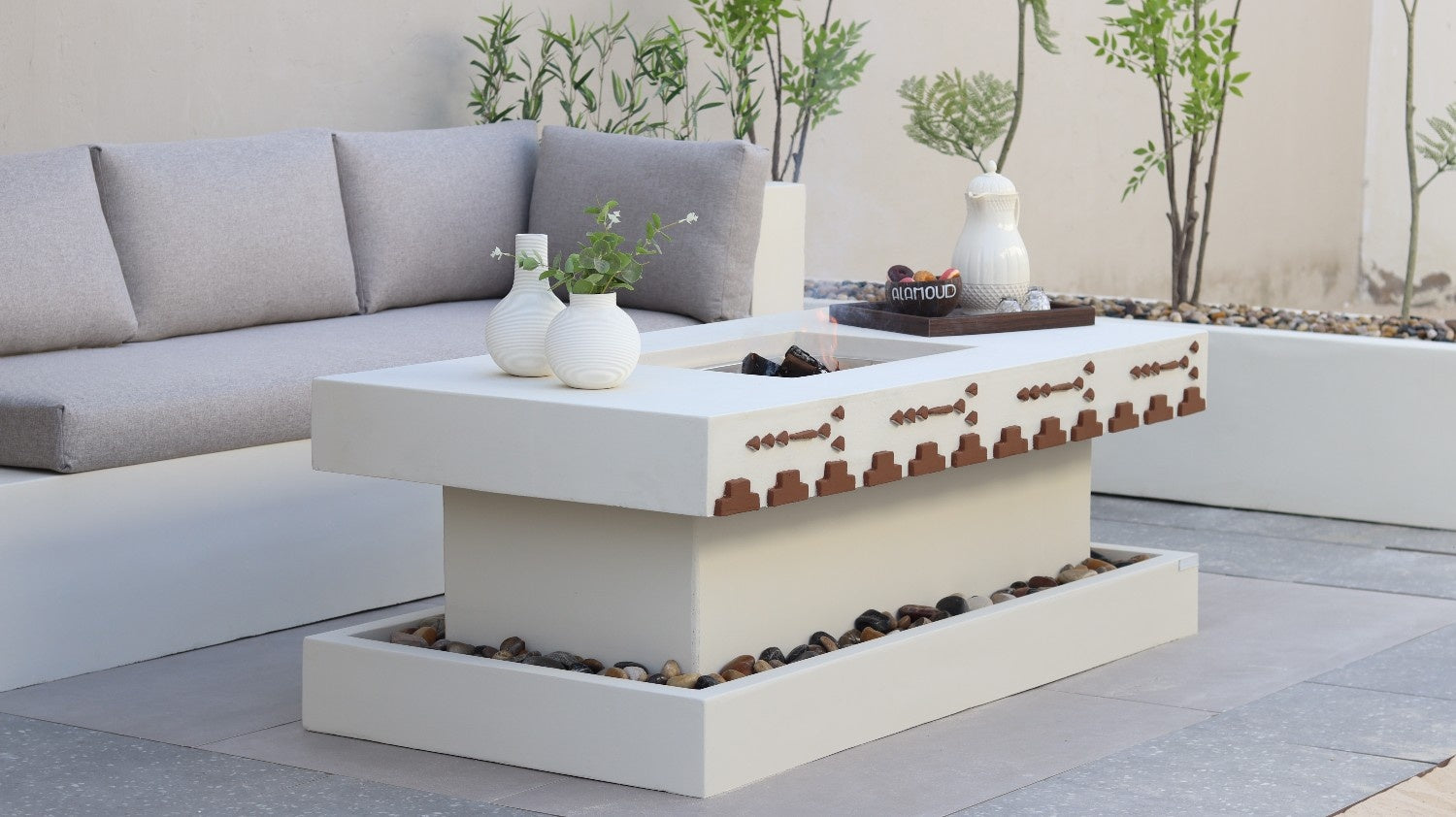 موقد بتصميم فاخر مصنوع من مادة الكونكريت عالية الجودة، مثالي للجلسات الخارجية ويجمع بين العملية والمتانة.
